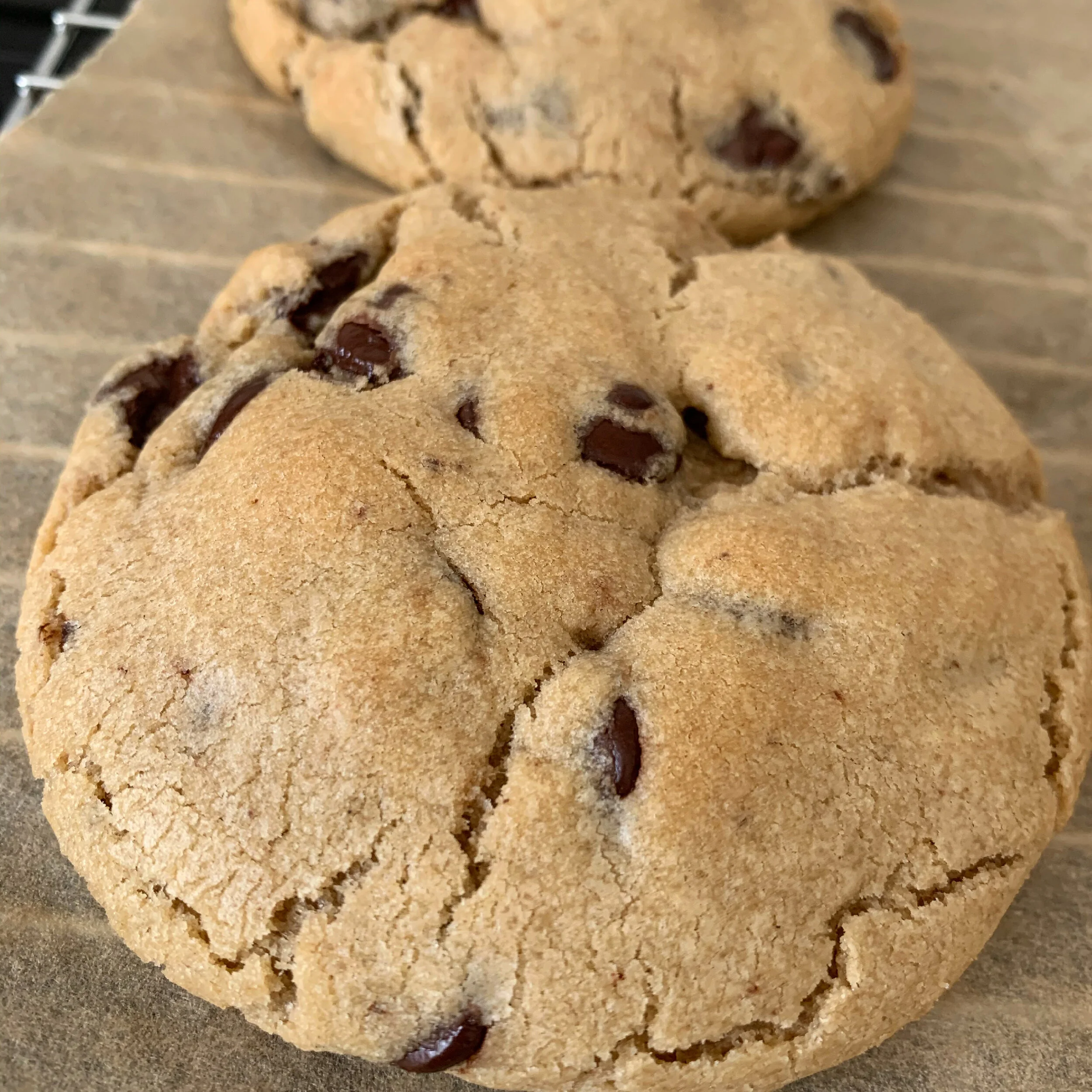 - Mix in both flours, bi carb, baking powder, choc chips slowly until forms a crumb