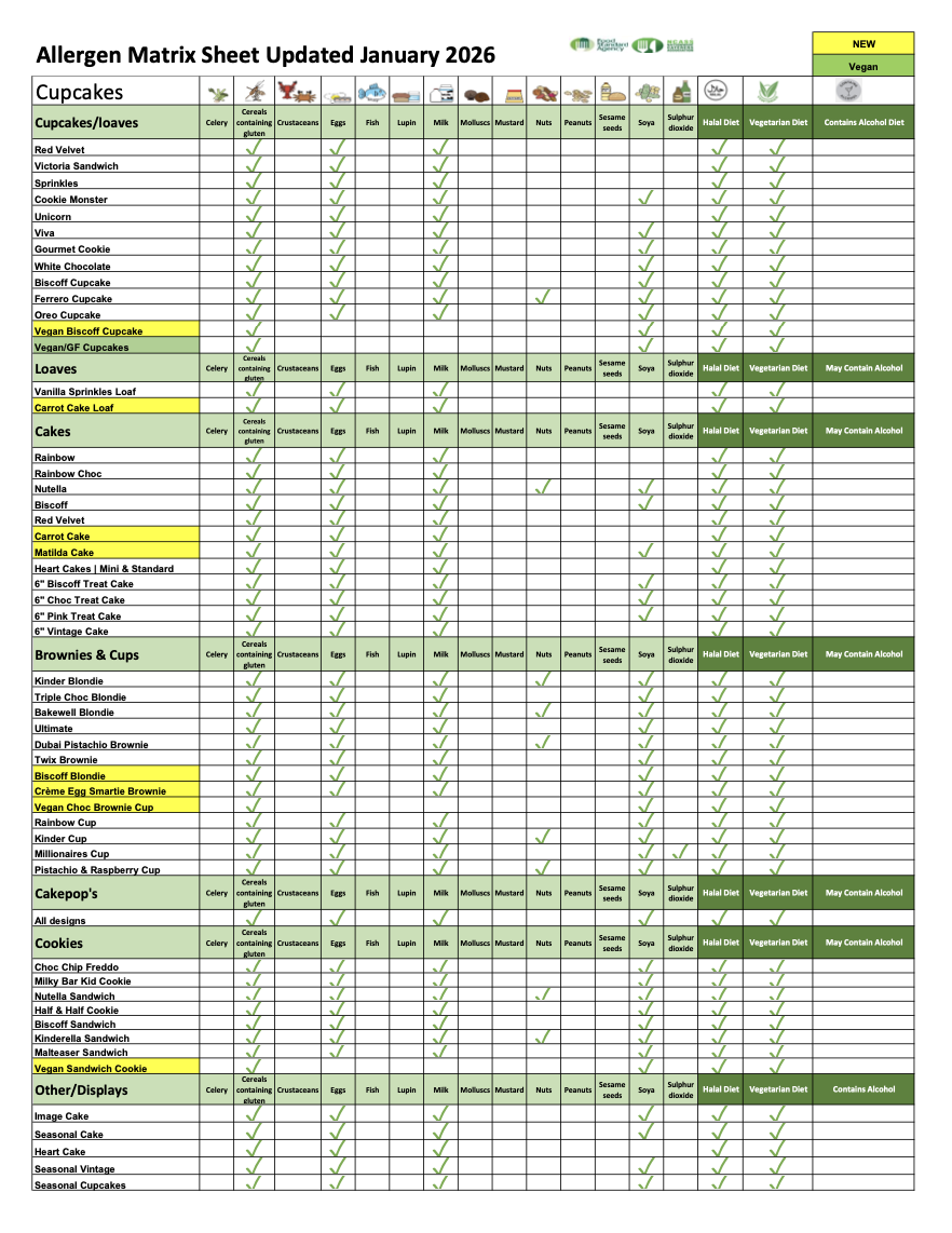Rainbow Cake - Flour (Wheat Flour, Calcium Carbonate, Niacin, Iron, Thiamin), Raising Agent (Disodium Diphosphate, Sodium Bicarbonate). Eggs, Sugar, Butter (Cream (Milk)) (Minimum 82% milk fat content). Vegetable oil (rapeseed, palm), water, Buttermilk (Milk), emulsifiers (sunflower lecithin, mono- and diglycerides of fatty acids), salt, natural flavouring (contains MILK), citric acid, vitamins (A, D), colour (carotenes). Vanilla Extract - Water, Monopropylene Glycol, Natural Vanilla Extract. Baking Powder (E450 Diphosphates, E500 Sodium Carbonates, Maize Starch). Philadelphia (Full Fat Soft Cheese (Milk), Salt, Stabiliser (Locust Bean Gum), Acid (Citric Acid)), Sugarflair Red (Glycerol E422, Propylene Glycol E1520, Silicon Dioxide E551, Water, Colours E124 Ponceau 4R & E129 Allura Red), Sugarflair Geen (E422 Glycerol, E1520 Propylene Glycol, E551 Silicon Dioxide, Food Colour (E102 Tartrazine, E133 blue FCF)), Sugarflair Blue (E422 Glycerol, E1520 Propylene Glycol, E551 Silicon Dioxide, Food Colour (E133 blue FCF, E122 Carmoisine))Sugarflair Yellow (Glycerol E422, Propylene Glycol E1520, Silicon Dioxide E551, Water, Colours E102 Tartrazine, E104 Quinolene), Sugarflair Purple (Glycerol E422, Propylene Glycol E1520, Silicon Dioxide E551, Water, Colours E122 Carmoisine, E133 Blue FCF), Sugarflair Orange (Glycerol E422, Propylene Glycol E1520, Silicon Dioxide E551, Water, Colours E110 Sunset Yellow, E129 Allura Red), Sprinkles Sugar, Hydrogenated Palm Kernel Oil, Palm Kernel Oil, Palm Oil, Corn Starch, Emulsifier (E322) Colours (E102, E133, E129, Beetroot Juice, Red Cabbage Juice, Annatto Extract) Glazing Agents (E965, E466, E903) Flavouring.